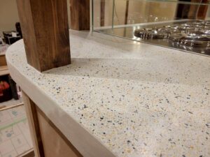 施工内容 本施工事例では、ジェラートショップのやわらかく親しみのある空間に合わせ、左官仕上げの素材感を活かしたTOGiDASHI(研ぎ出し)仕上げをカウンター天板に採用しました。 素材の表情が主張しすぎないよう、ベースに […]